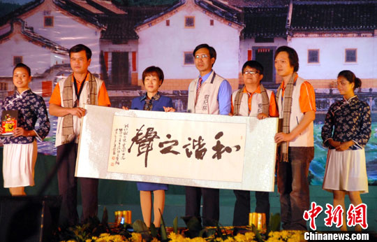 12月2日晚,在廣西賀州舉行的首屆客家文化旅游節兩岸文藝界聯誼晚會上,兩岸音樂人共奏“和諧之聲”,洋溢同胞親情,感動現場大批觀眾。圖為聯誼晚會上,兩岸文藝人士互贈禮物。 中新社發 廖祖平 攝