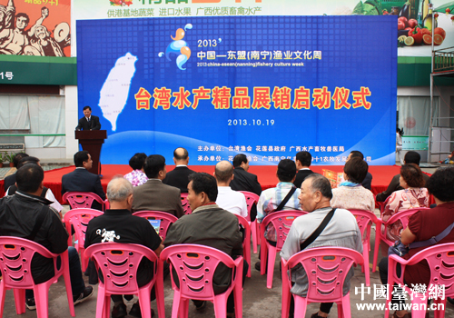 中國臺灣網(wǎng)10月21日南寧消息 10月19日上午,臺灣水產(chǎn)精品展銷專區(qū)啟動儀式在廣西水產(chǎn)畜牧業(yè)名特優(yōu)產(chǎn)品展銷展示中心的小廣場隆重舉行。國臺辦、廣西臺辦、臺灣漁會參訪團(tuán)、廣西水產(chǎn)畜牧獸醫(yī)局、各市水產(chǎn)畜牧獸醫(yī)局及直屬單位、廣西大學(xué)動物科技學(xué)院、廣西漁業(yè)龍頭企業(yè)、新聞媒體等260人參加了啟動儀式。