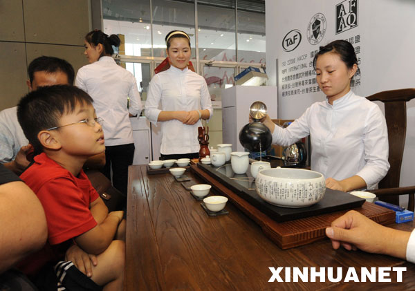 一名南京小朋友在準(zhǔn)備品嘗一家茶葉企業(yè)的功夫茶。