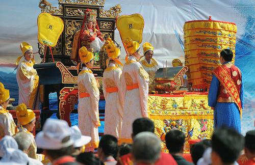 11月1日,湄洲媽祖文化旅游節(jié)上舉行祭典媽祖活動(dòng)。當(dāng)日,以慶祝媽祖信俗成功申報(bào)人類(lèi)非物質(zhì)文化遺產(chǎn)為主要活動(dòng)內(nèi)容的第十一屆中國(guó)湄洲媽祖文化旅游節(jié)在媽祖故鄉(xiāng)福建湄洲島開(kāi)幕。來(lái)自海內(nèi)外26個(gè)國(guó)家和地區(qū)的萬(wàn)余名中華兒女齊聚湄洲島,圍繞“同謁媽祖,共享平安”的主題,舉行包括媽祖祭典、海峽媽祖文化旅游推介會(huì)和第五屆湄洲媽祖海峽論壇等內(nèi)容的活動(dòng)。新華社記者姜克紅攝