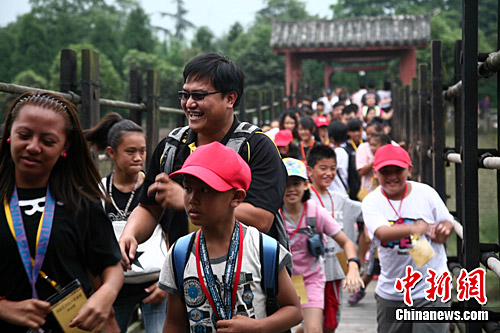 7月8日,由臺灣少數民族民意代表高金素梅率領的由臺灣“8.8”風災災區民眾組成的參訪團抵達四川地震災區都江堰,在這里臺灣風災災區兒童親眼目睹了世界遺產都江堰水利工程。圖為臺灣災區兒童在都江堰水利工程的索橋上經過。中新社發 張浪 攝