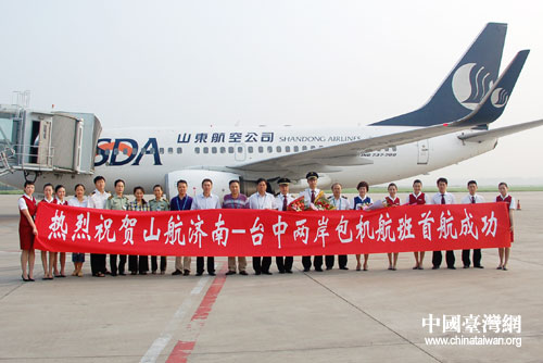 中國臺灣網7月23日濟南消息 今日上午8時,隨著山東航空股份有限公司一架滿載旅客的波音737-700飛機自濟南遙墻國際機場騰空而起,濟南至臺中市包機航線正式開通。