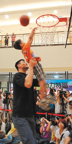 姚明抱起小男生灌籃,全場歡呼聲不斷。 來源:臺灣《聯合報》