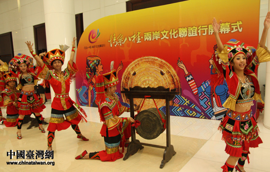 中國(guó)臺(tái)灣網(wǎng)8月17日南寧消息 身著盛裝的壯族帥小伙們敲響迎客的銅鼓,美麗的姑娘們亮出婉轉(zhuǎn)的歌聲,在這個(gè)七夕之夜歡迎來自海峽兩岸尊貴的客人。101名臺(tái)灣文化教育界人士和50余名大陸文化界人士歡聚一堂,悠揚(yáng)的山歌聲中,“情系八桂——兩岸文化聯(lián)誼行”聯(lián)歡晚會(huì)徐徐拉開帷幕。