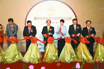 9月3日,淮揚美食揚州冶春茶社臺北店京華城開業。臺灣立法機構負責人王金平等參加典禮。這是大陸國有資本入島投資實體項目的首例,也是大陸餐飲業在臺投資規模最大的項目。陳榮富 攝