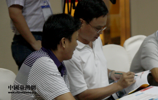 18日晚,第二屆兩岸鄉(xiāng)村座談舉行兩岸結(jié)對子鄉(xiāng)村見面會(huì),兩岸30個(gè)鄉(xiāng)村代表參加。圖為參會(huì)代表在翻看結(jié)對子鄉(xiāng)村的有關(guān)資料。(中國臺(tái)灣網(wǎng) 張弛 攝)