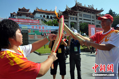 莆田籍運動員、首屆青奧會激流回旋冠軍王曉東和一名身著湄洲女服飾的圣女,共同點取象征“大愛之光、吉祥之火”的福建省第十四屆運動會圣火。林劍冰 攝