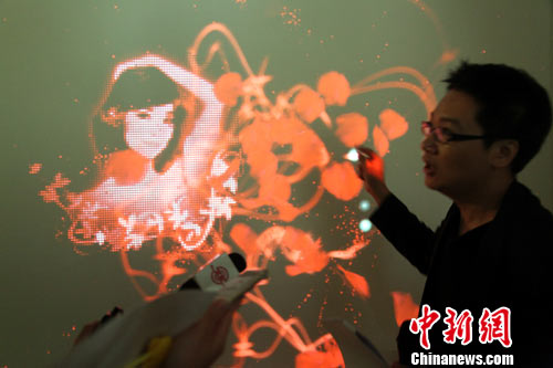 以鄧麗君為主題的臺北花博“名人館”,10月6日首次向媒體公開。圖為展館重頭戲“花語廳”內設置的“落英繽紛”藝術裝置,可讓多位參觀者同時伸手掬起一朵朵鄧麗君生前最喜愛的玫瑰花(數碼模擬),使其累積疊加,幻化成鄧麗君令人懷念的容貌。