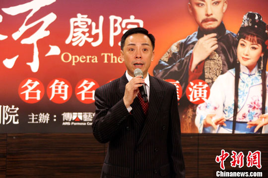 10月14日,著名京劇藝術家于魁智在臺北亮相。圖為于魁智在當天的記者會上即興演唱傳統劇目《上天臺》選段。 中新社發 王健 攝