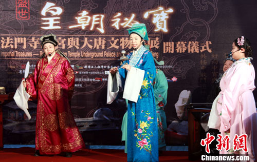 薈萃120件(組)唐代文物精品的“法門寺地宮與大唐文物特展”,28日在位于臺北市南海路的歷史博物館舉行盛大開幕儀式。圖為主辦方在開幕儀式上特地安排了一場表現唐代文人雅士聚會的情景秀,以助其盛。