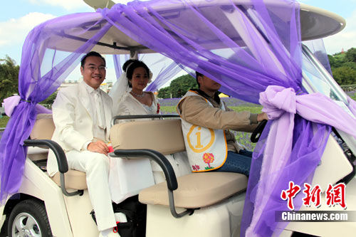 圖為當天按傳統禮俗“抽捧花”中選的3對幸運新人,得以搭乘“幸福游園車”率先周游觀覽園區美景。中新社記者 王健 攝