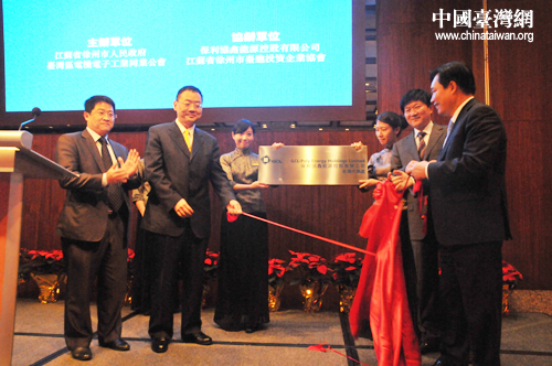 作為本次研討會的重頭戲和重要成果,保利協鑫能源控股有限公司臺灣代表處正式成立,徐州市委書記曹新平,保協鑫(集團)控股有限公司董事長、保利協鑫能源控股有限公司董事局主席朱共山先生,臺灣區電機電子工業同業公會理事長、華邦電子股份有限公司董事長焦佑鈞先生,協鑫光電科技發展有限公司常務副總裁兼臺灣代表處總裁單伶寶先生為保利協鑫公司臺灣代表處揭牌。這標志著徐臺兩地“雙向投資”新階段的到來,從而拉開了徐資入島的序幕。