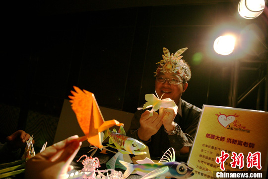 1月4日,臺灣高雄市在香港推介“2011高雄燈會藝術節”,著名剪紙藝術家洪新富向來賓展示精彩剪紙手藝,為2月12日至28日高雄市舉行的水舞高空煙花匯演大型燈會宣傳。 中新社發 洪少葵 攝