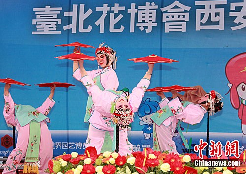 3月16日,臺北“西安文化日”活動在花博園區精彩登場。圖為西安藝人在活動日開幕式上表演戲曲雜技。中新社發 符永康 攝