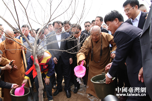 星云大師為親手種植的菩提樹澆水。(圖片來源:葫蘆島市臺辦)