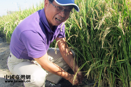 臺中市議員陳清龍向技術(shù)人員詢問旱稻種植的滴灌技術(shù)。(中國臺灣網(wǎng) 王偉 攝)