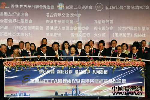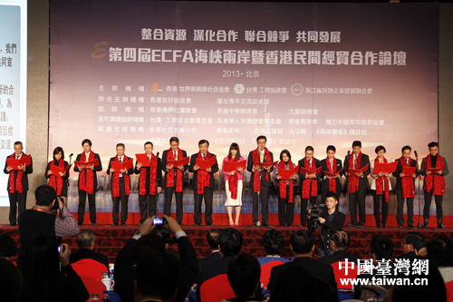 中國(guó)臺(tái)灣網(wǎng)12月9日北京消息 9日下午,匯聚兩岸三地民營(yíng)企業(yè)精英、以“整合資源、深化合作、聯(lián)合競(jìng)爭(zhēng)、共同發(fā)展”為主題的第四屆ECFA海峽兩岸暨香港民間經(jīng)貿(mào)合作論壇在北京舉行。全國(guó)政協(xié)副主席李海峰,海協(xié)會(huì)顧問(wèn)陳云林,臺(tái)灣“三三企業(yè)交流會(huì)“會(huì)長(zhǎng)、前海基會(huì)董事長(zhǎng)江丙坤,世界華商聯(lián)合促進(jìn)會(huì)會(huì)長(zhǎng)許榮茂等出席論壇。