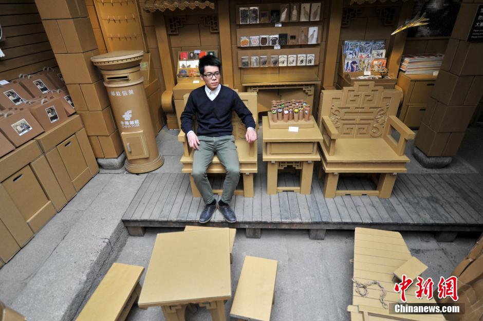 12月23日,福建首家臺灣紙箱王創(chuàng)意園落戶福州三坊七巷,創(chuàng)意園里結(jié)合了福州三坊七巷各個景點,打造一個夢幻的紙世界。圖為民眾體驗紙制桌子,可承受300斤重力。呂明 攝