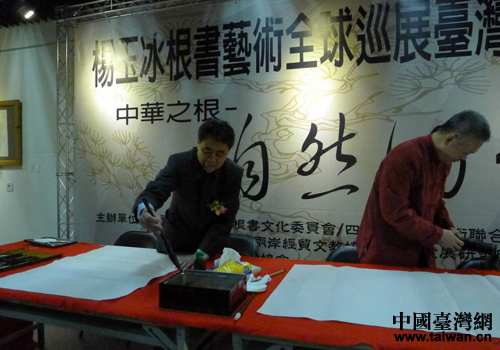 楊玉冰(左一)在展覽開幕式上與臺灣藝術(shù)家共同揮毫。