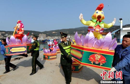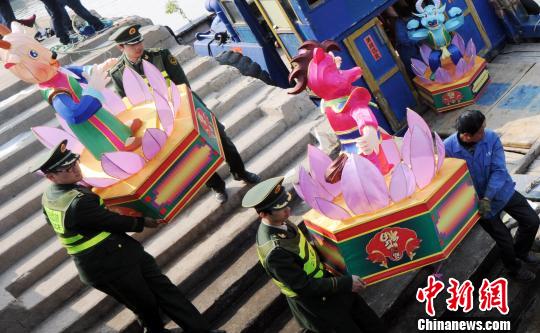 當日,福州連江縣黃岐臺輪停泊點碼頭上,走馬燈、八駿圖、馬年特制花燈、媽祖女神燈、新春喜慶燈等已依次卸下車,擺放整齊。福州連江黃岐邊防派出所官兵,正協(xié)助工作人員將贈送馬祖同胞的包括馬年生肖花燈在內(nèi)的中華傳統(tǒng)文化燈(十二生肖),搬運裝船。