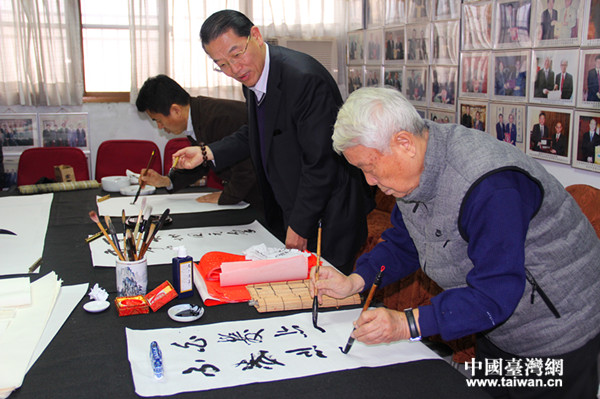 中國臺灣網(wǎng)2月15日高雄消息 2月14日上午,應(yīng)臺灣中華海峽兩岸企業(yè)交流協(xié)會的邀請,參加第三屆高雄燈會藝術(shù)節(jié)暨北京特色周活動的書畫家程茂全、王興家、張和平、慕云五,與來自臺灣的康景文、楊濤、陳麗卿、洪塔美等書畫家在高雄舉辦了“兩岸書畫家交流筆會”。兩岸書畫家揮毫潑墨,以筆會友,以畫傳情。(中國臺灣網(wǎng)記者 李婷婷)