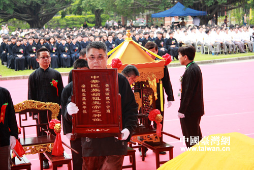 成年禮大典現場,東莞臺商子弟學校董事長葉宏燈親自護送中華民族始祖炎帝神位!。ㄖ袊_灣網發 王羽威攝)