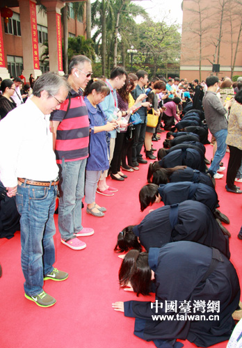 參加成年禮學生向父母行叩拜禮,感謝父母養育之恩!。ㄖ袊_灣網發 王羽威攝)