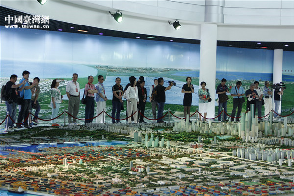 臺(tái)灣中南部媒體訪問團(tuán)采訪天津?yàn)I海新區(qū),圖為天津?yàn)I海新區(qū)規(guī)劃展覽館內(nèi)合影。(中國(guó)臺(tái)灣網(wǎng) 段雯婷 攝)
