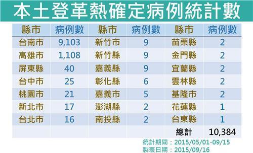 今年5月入夏截至9月15日,臺南市登革熱病例數突破9000例,其中以北區3095例最嚴重,其次是中西區1390例,南區1345例,永康區976例,安南區753例,東區726例,安平區292例。