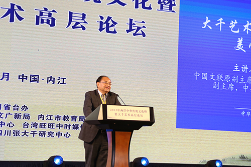 主題演講以“中華傳統文化的傳承與大千藝術的弘揚”為主題,來自大陸的著名劇作家、文學家、詩人蘇叔陽,中國文聯原副主席、中國文藝評論家協會主席、著名評論家仲呈祥,著名劇作家、辭賦作家魏明倫和來自臺灣的臺灣藝術大學原校長、臺灣歷史博物館原館長黃光男,臺灣著名詩人、作家鄭愁予,臺灣著名書法家、臺灣中華書學會會長、淡江大學教授張炳煌等知名文人學者分別發表演講,兩岸近200名文化界、教育界人士、臺商代表、青年學生共襄盛舉。
