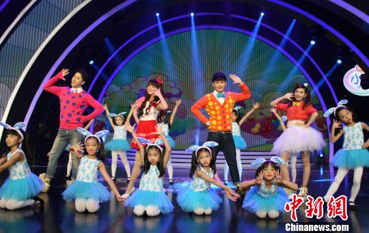 晚會上,臺灣東森電視臺蜜蜂姐姐和福建少兒頻道蝸牛哥哥、長頸鹿哥哥、芭樂姐姐帶動兩岸小朋友作精彩表演。 黃帆 攝