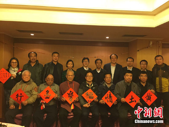 圖為陳逢顯(前排左3)與甘肅慶陽文博參訪團成員合影。前排左4為團長閻曉峰。全體人員手持書法家現(xiàn)場所寫春聯(lián),有迎接新年到來的溫馨氣氛。