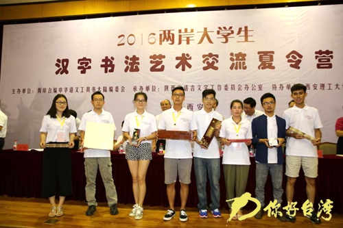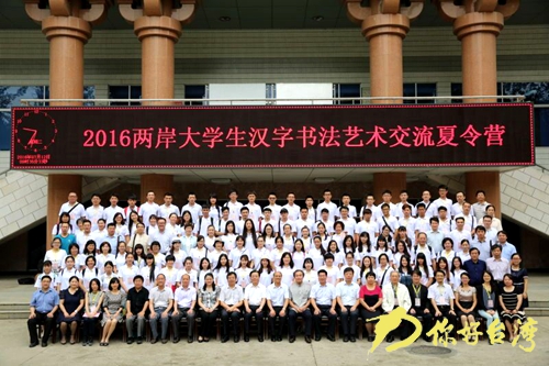 2016兩岸大學生漢字書法藝術交流夏令營同日開營。兩岸合編中華語文工具書大陸代總召集人彭興頎,臺灣總召集人、中華文化總會秘書長楊渡為兩岸營員授營旗。今年的夏令營活動是繼2014、2015年分別在浙江紹興文理學院和臺灣藝術大學成功舉辦后,由國家語委牽頭的兩岸合編中華語文工具書大陸編委會和臺灣中華文化總會繼續聯合主辦,由陜西省語委辦接力承辦、西安理工大學和陜西師范大學兩所高校協辦的。來自陜西和臺灣高校的十多所高校100名大學生將在為期8天的時間里,參加漢字書法藝術講座、書法教學、書法創作展示、觀摩碑林等活動,通過“體驗式交流”,了解兩岸語言文字使用和交流現狀,體驗兩岸語言文字與文化的“同根同源”“和而不同”,增進理解信任,共同珍惜、尊重和傳承中華優秀語言文化,增加對中華文化的熱愛和認同。