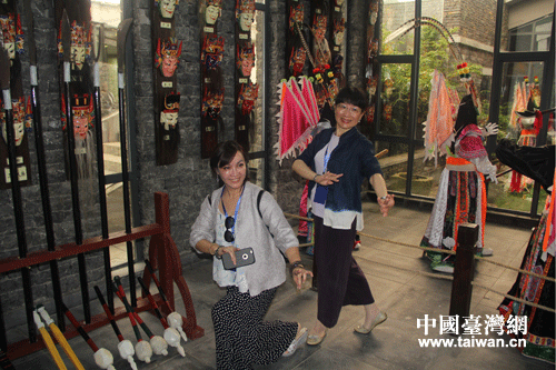 臺灣藝術家在地戲模型前擺出舞姿(中國臺灣網 蕪同 攝)