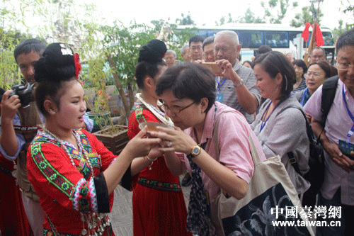 臺灣嘉賓體驗貴州非物質文化遺產酸湯魚時,受到苗族姑娘們的特殊歡迎(中國臺灣網 蕪同 攝)