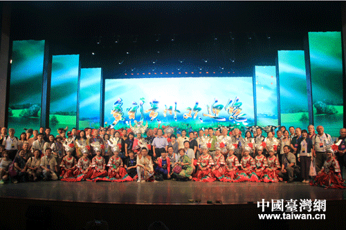 兩岸文化界人士在觀看大型民族歌舞晚會多彩貴州風后上臺與演員合影(中國臺灣網 蕪同 攝)