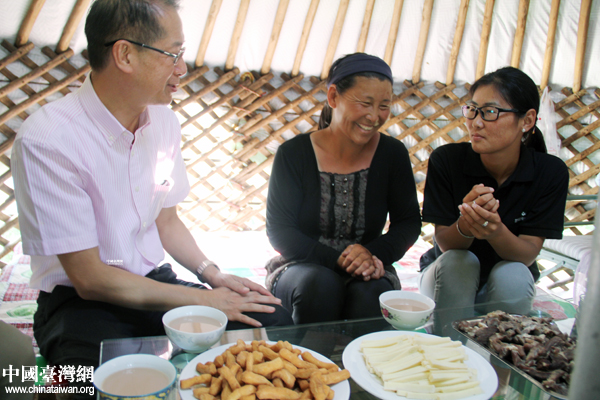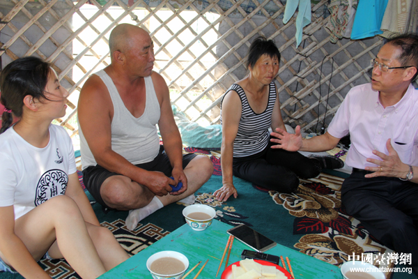 滕鴻年來到達日丹(左一)家蒙古包,與其父母話家常。(中國臺灣網(wǎng) 王思羽 攝)