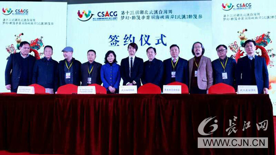 隨后,主持人邀請海峽兩岸機構及企業代表上臺進行簽約儀式。余培俠等嘉賓上臺見證。武漢動漫協會與臺灣動漫文化創意產業發展交流協會、武漢東湖學院與香港動漫畫協會、武漢博潤通文化科技股份有限公司與臺灣冉色斯動畫股份有限公司六家單位分別簽署戰略合作協議,將在行業組織協作、產學研交互融合、業務拓展開發等方面開展廣泛合作與對接。見證嘉賓表示,簽約儀式象征著海峽兩岸動漫文化創意產業融合發展的新起點。