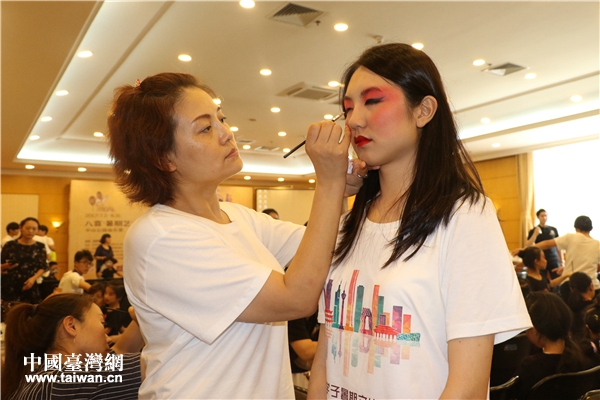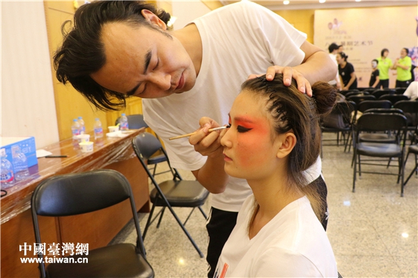 京劇老師為臺灣青年化妝。(中國臺灣網 趙苗青 攝)