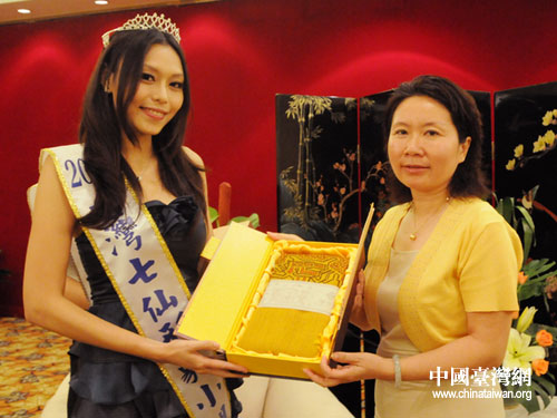 海南省臺辦副主任劉錦會見入圍七仙形象小姐總決賽三位臺灣佳麗并向她們贈送禮品(海南臺辦唐小平 攝)