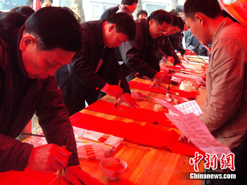 20日下午,海南省藝術家、書法獲獎者和臺灣書法家在文昌開展海峽兩岸書法家“送歡樂、下基層”義務揮春活動。(完)(張茜翼)