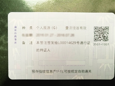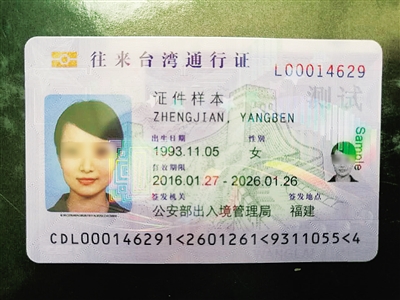 據了解,電子往來臺灣通行證為參照有關國際標準設計制作的卡式證件,內嵌非接觸式集成電路芯片。前往臺灣簽注不再采取貼紙的方式,而是直接打印在證件背面,并可重復擦寫。成人電子往來臺灣通行證有效期延長為10年,對未滿16周歲的居民仍簽發5年有效通行證。