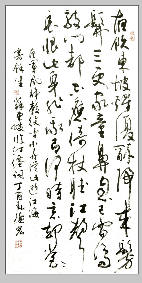 龔德宏將軍以蒼勁的行草,書寫了東坡《臨江仙·夜飲東坡醒復醉》全文,表達著不被困難和痛苦所屈服,以超人的意志從大自然中感悟人生哲理、尋求美好享受的曠達襟懷。