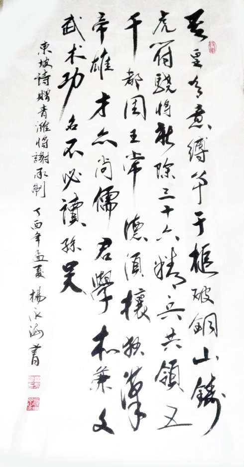 海南省軍區參謀長、副司令員、海南省書法家協會會員楊永海將軍,特意書寫東坡贈給出征武將的壯行詩《贈青濰將謝承制》,以彰示要使邊疆平靖就必須文武兼備、必施文韜武略的決心和信心。