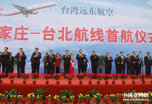 海峽交流協(xié)會(huì)副會(huì)長(zhǎng)王富卿指出,臺(tái)灣遠(yuǎn)東航空公司把大陸航線的首飛儀式選擇在石家莊,體現(xiàn)了臺(tái)灣工商企業(yè)界的朋友,對(duì)河北人民的真誠給予熱情的回饋,對(duì)河北的建設(shè)成就給予熱切關(guān)注,對(duì)河北的發(fā)展未來充滿信心。他說,石家莊臺(tái)北航線的開通使冀臺(tái)“一日生活圈”成為現(xiàn)實(shí),翻開了河北與臺(tái)灣深化交流合作的一頁新篇。