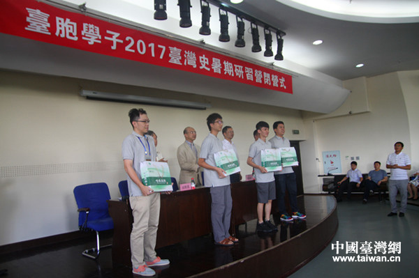 中國臺灣網7月25日哈爾濱消息 (記者 李杰)24日,由全國臺聯和海峽兩岸交流中心共同主辦的“臺胞學子2017臺灣史暑期研習營”在哈爾濱工業大學舉行閉營式,全國臺聯副會長紀斌、黑龍江省臺聯會長劉繼維、哈爾濱工業大學校黨委常務副書記熊四皓、黑龍江省臺聯黨組書記衣光、全國臺聯研究室主任陳立謙、哈爾濱工業大學統戰部長張淑娣、夏朝聯合會評議長許育嘉、臺灣《遠望》雜志社總編輯石佳音、青雁和平教育基金會董事暨執行長喬正中等領導和嘉賓出席了閉營式,并為在研習營微視頻評選中獲獎的營員頒獎。