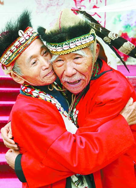 12月18日上午,在阿里山鄉達邦村特富野社區,鄒族頭目汪念月(左)與鄧州市張村鎮上營村村委主任湯清義(右)緊緊擁抱在一起! ∮浾摺£悅ァz