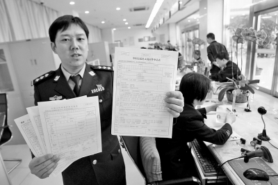 民警向記者展示以前辦理三類證件所需填寫的三張表格(右手所拿)和今后需填寫的表格(左手所拿)