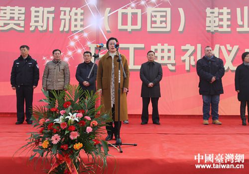 中國臺灣網1月10日周口訊 1月9日上午,臺資費斯雅高端制鞋項目開工儀式在周口市西華縣舉行。意大利費斯雅品牌亞洲區副總裁恩地,周口市委常委、統戰部長方婷、商務局局長閆淑娟、西華縣縣長田慶杰等出席開工儀式。方婷下達開工令。