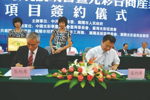 為加快招商步伐,今年5月至7月,襄陽光彩臺商產業園在上海、蘇州、昆山、廈門、東莞等地成功舉辦了項目推介會,招商成效非常明顯。有意向投資的426家臺商企業已分批來到襄陽光彩臺商產業園區實地考察,進行深層次的磋商,達成投資協議。其中55名臺灣企業家簽訂了投資意向書,投資總額20.1億美元,項目涵蓋電子、農產品、再生資源、文化等領域。